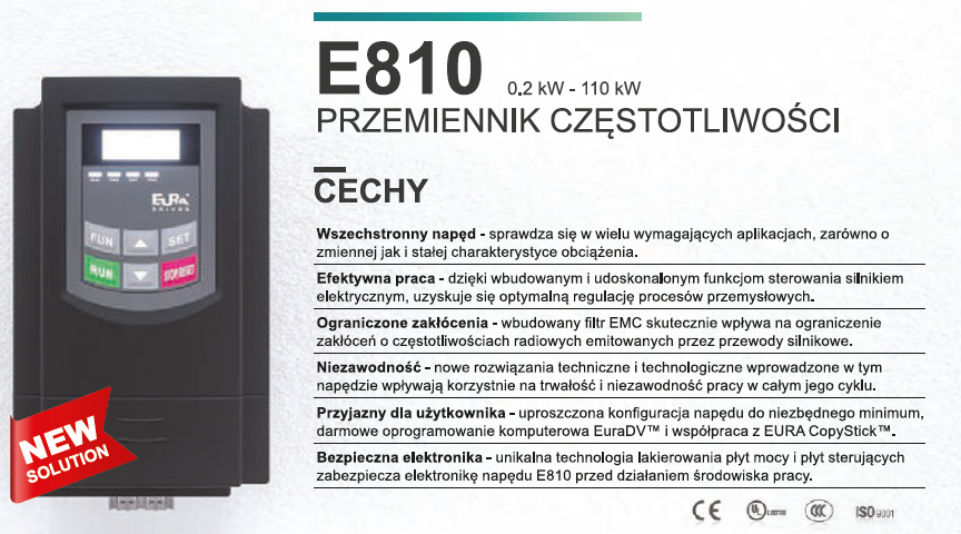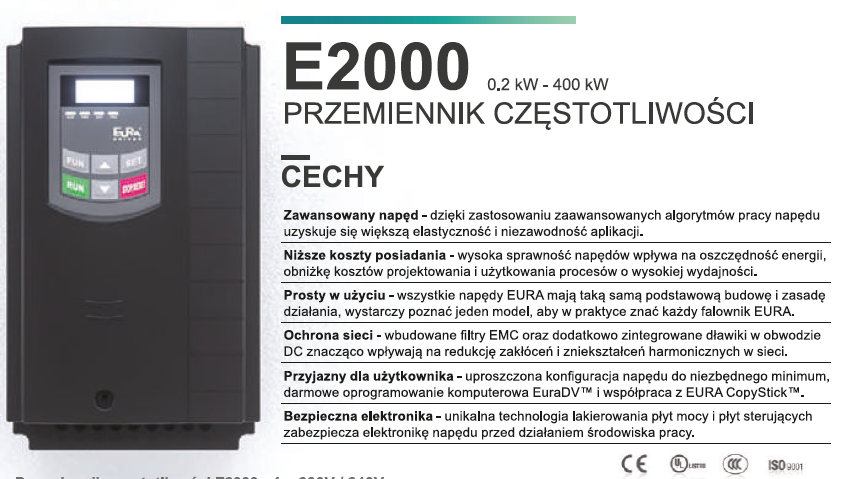 E-2000 Vector to falowniki ogólnego zastosowania ze sterowaniem wektorowym bez czujnikowym. Dzięki zastosowaniu zaawansowanych algorytmów sterowania wektorem pola, falowniki te idealnie sprawdza się w zaawansowanych aplikacjach przemysłowych. W standardzie wbudowany filtr przeciwzakłóceniowy EMC, moduł hamujący oraz komunikacja RS-485 protokołem ModBus, wbudowane szybkie wejście i wyjście licznikowe i wiele innych funkcji czynią to falowniki bardzo atrakcyjnymi na naszym rynku.