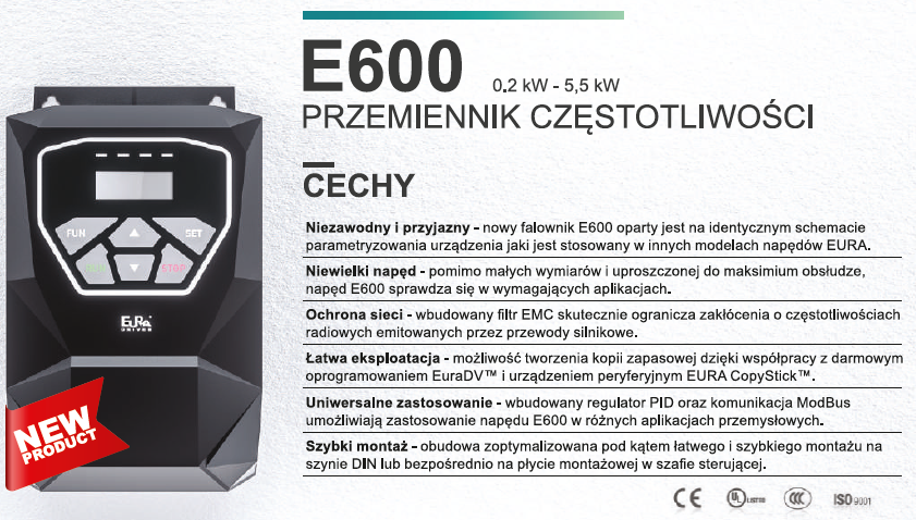 Przemienniki częstotliwości EURA E-600 charakteryzują się nowoczesnym wzornictwem oraz niewielką i kompaktową konstrukcją. Został stworzony dla prostych i niewymagających aplikacji, takich jak napędy wentylatora, pompy i przenośniki taśmowe. Pomimo małych wymiarów i uproszczonej do maksimum obsłudze, napęd E-600 sprawdza się w aplikacjach, w których ważna jest nie tylko kontrola pracy silnika, ale również oszczedność energii elektrycznej. Wbudowany filtr EMC, regulator PID oraz komunikacja ModBus umozliwiają zastosowanie tego falownika w różnych aplikacjach przemysłowych. Obudowa została zoptymalizowana pod kątem łatwego i szybkiego montażu na szynie DIN lub bezpośrednio na płycie montażowej w szafie sterującej.