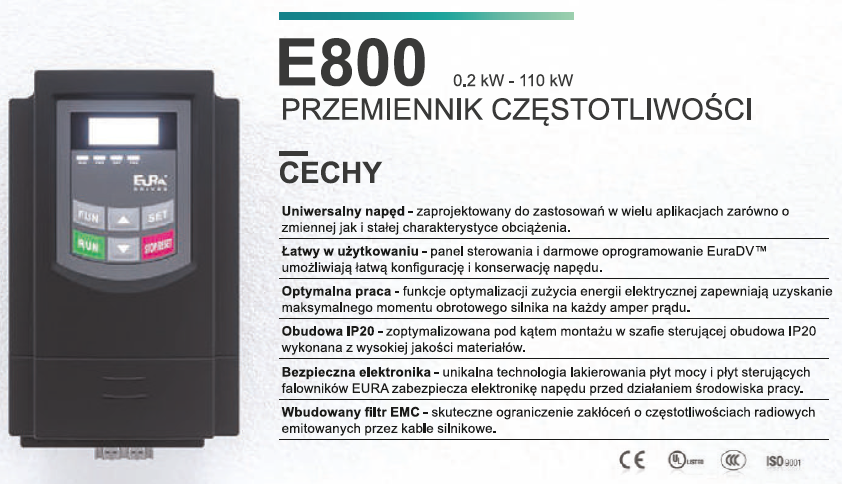 Falowniki E-800 (skalarne) są to przemienniki dedykowane dla branży wentylacyjnej oraz wodno-kanalizacyjnej. Proste w budowie, łatwe w obsłudze falowniki E-800 idealnie sprawdzają się w maszynach przepływowych, takich jak pompy czy wentylatory. Ponadto w falownikach serii E-800 zostały zaimplementowane funkcje przeciw-pożarowe, dzięki czemu mogą być one stosowane do sterowania wentylacji oddymiającej.